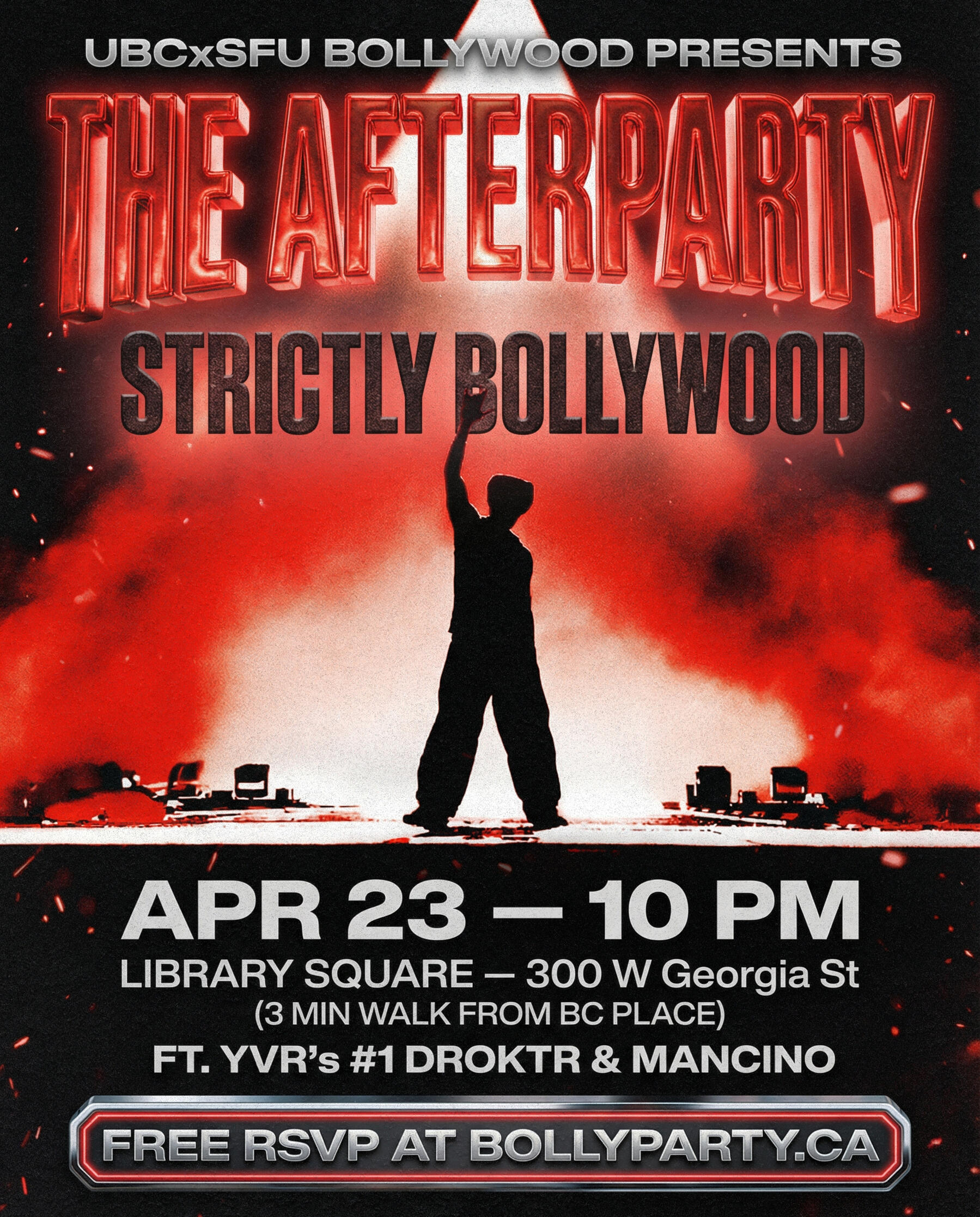 THE AFTERPARTY: STRICTLY BOLLYWOODOn APR 23 2026, we’re taking over Library Square for THE AFTERPARTY — a late-night Bollywood experience built for the crowd that still wants more.Featuring YVR’s #1 DROKTR alongside MANCINO, this one is built for big energy from start to finish.WHAT TO EXPECT